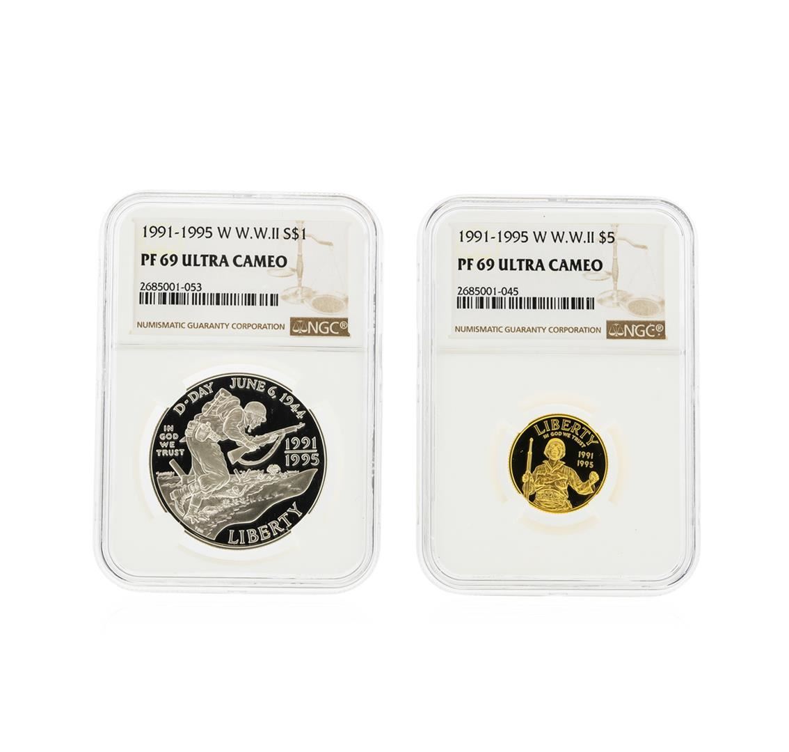 1991-1995W WWII Commemorative $5 Gold Coin and $1 Silver Coin Set NGC PF69 Ultra