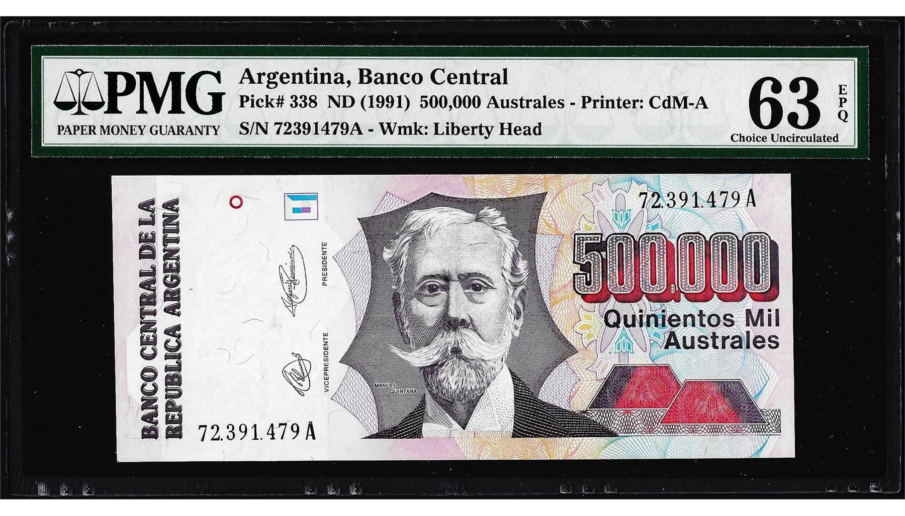 One 1991 Argentina Banco Central 500,000 Australes Note Pick# 338 PMG Choice Uncirculated 63EPQ. PMG Certified.