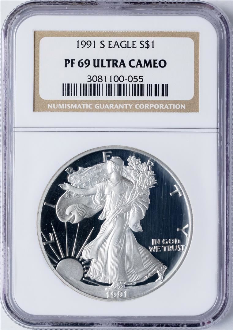 One 1991-S $1 Proof American Silver Eagle Coin NGC PF69 Ultra Cameo. NGC Certified.