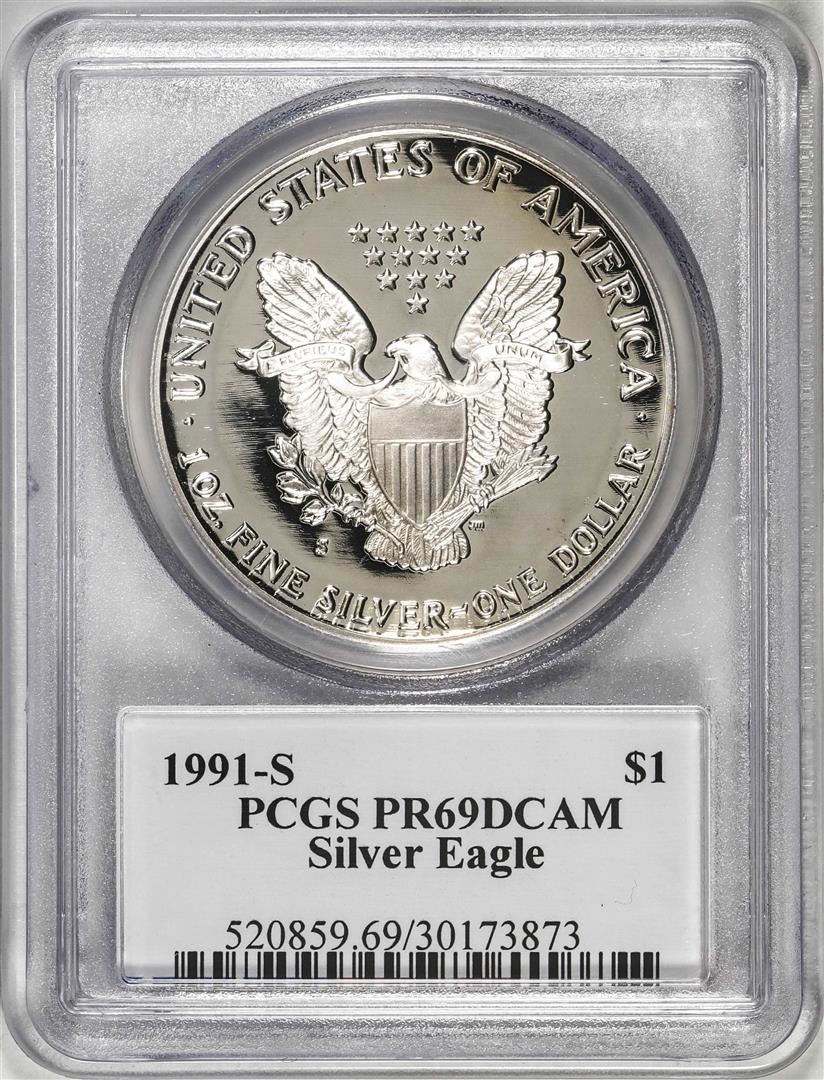One 1991-S $1 Proof American Silver Eagle Coin PCGS PR69DCAM Edmund Moy Signature. PCGS Graded.