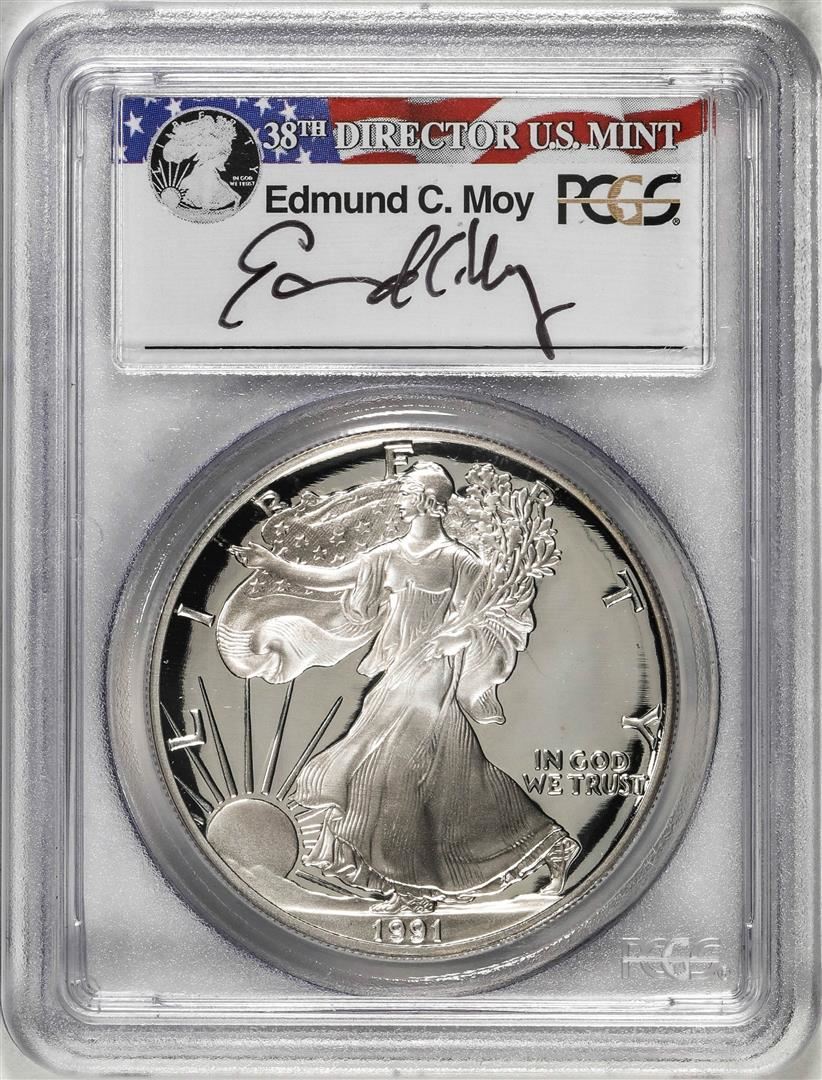One 1991-S $1 Proof American Silver Eagle Coin PCGS PR69DCAM Edmund Moy Signature. PCGS Graded.