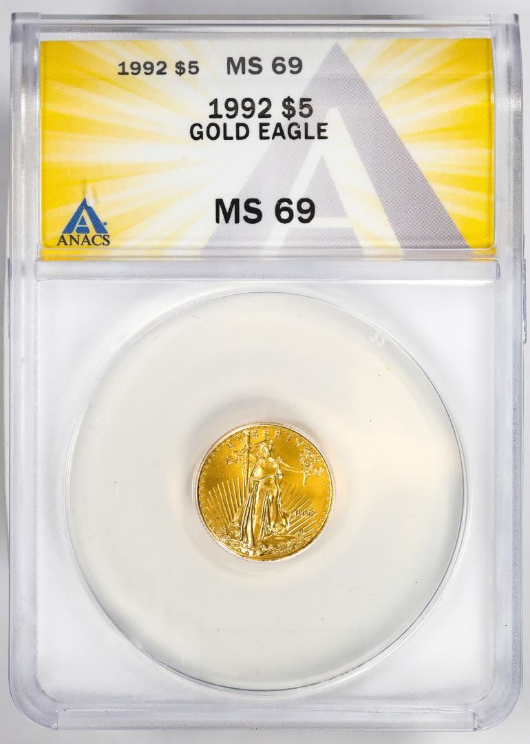 One 1992 $5 American Gold Eagle Coin ANACS MS69. ANACS Certified.