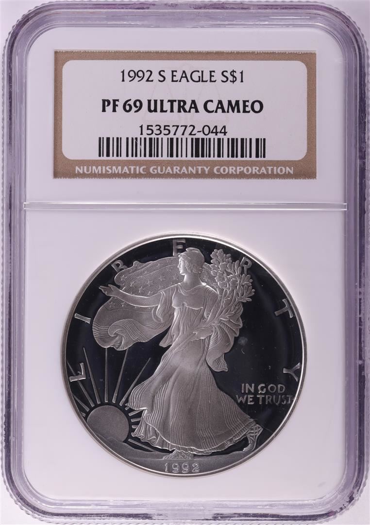 One 1992-S $1 Proof American Silver Eagle Coin NGC PF69 Ultra Cameo. NGC Certified.