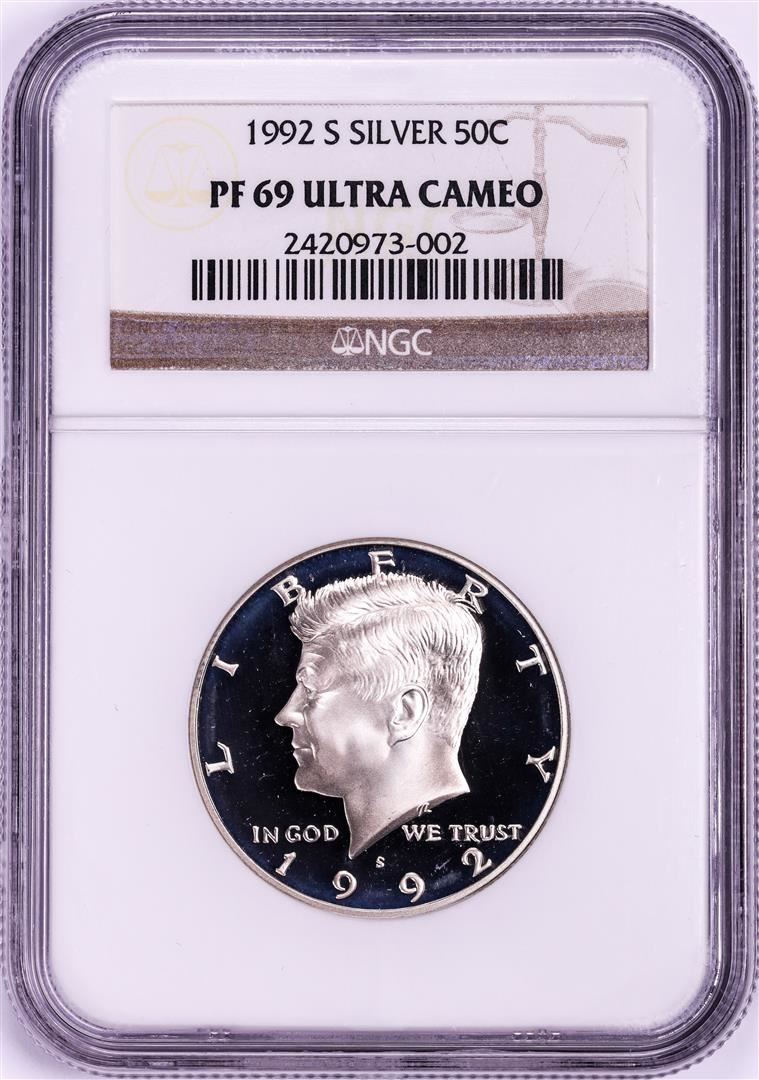 One 1992-S Silver Proof Kennedy Half Dollar Coin NGC PF69 Ultra Cameo.