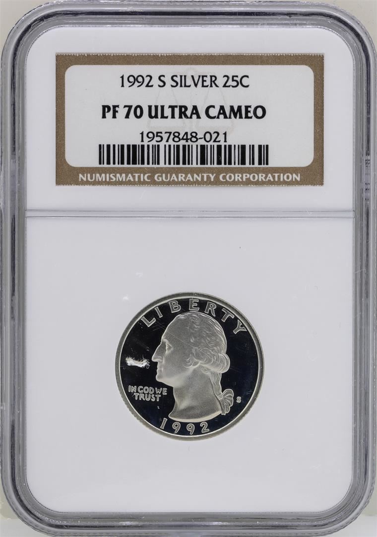 One 1992-S Washington Silver Proof Quarter Coin NGC PF70 Ultra Cameo. NGC Certified.