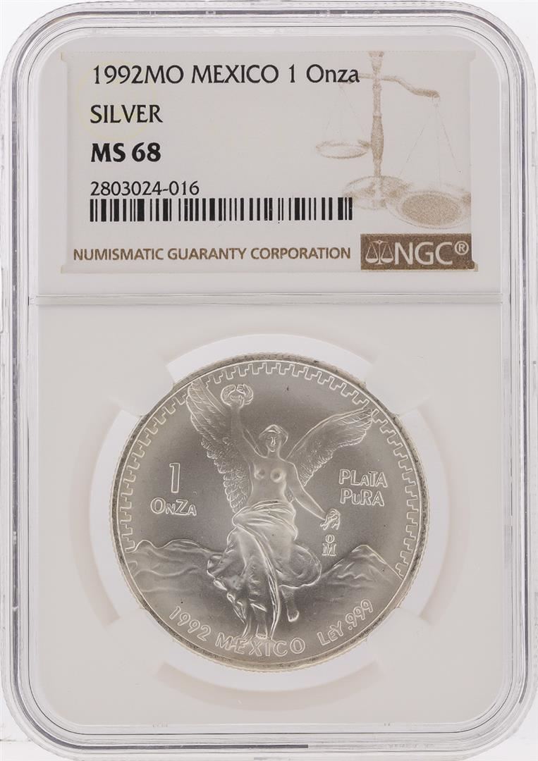 One 1992MO Mexico 1 Onza Libertad Silver Coin NGC Graded MS68. NGC Certified.