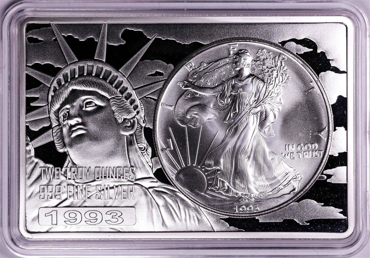 One 1993 $1 American Silver Eagle Coin & 2oz Silver Bar Set.