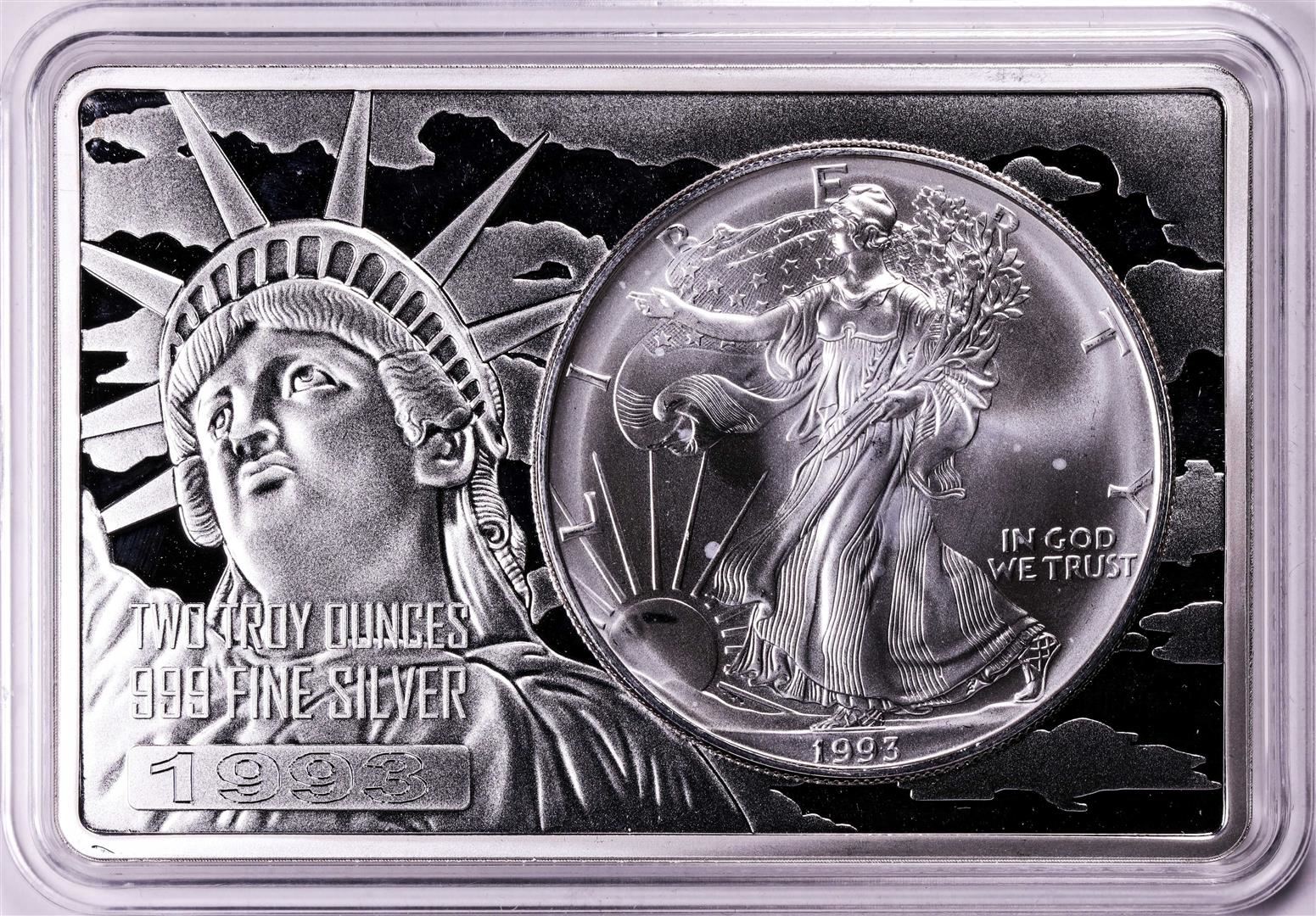 One 1993 $1 American Silver Eagle Coin & 2oz Silver Bar Set.
