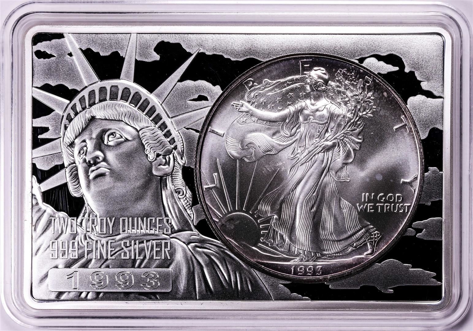 One 1993 $1 American Silver Eagle Coin & 2oz Silver Bar Set.
