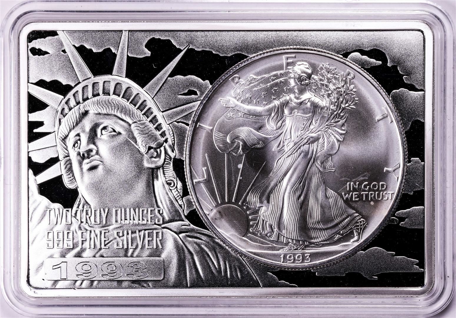One 1993 $1 American Silver Eagle Coin & 2oz Silver Bar Set.