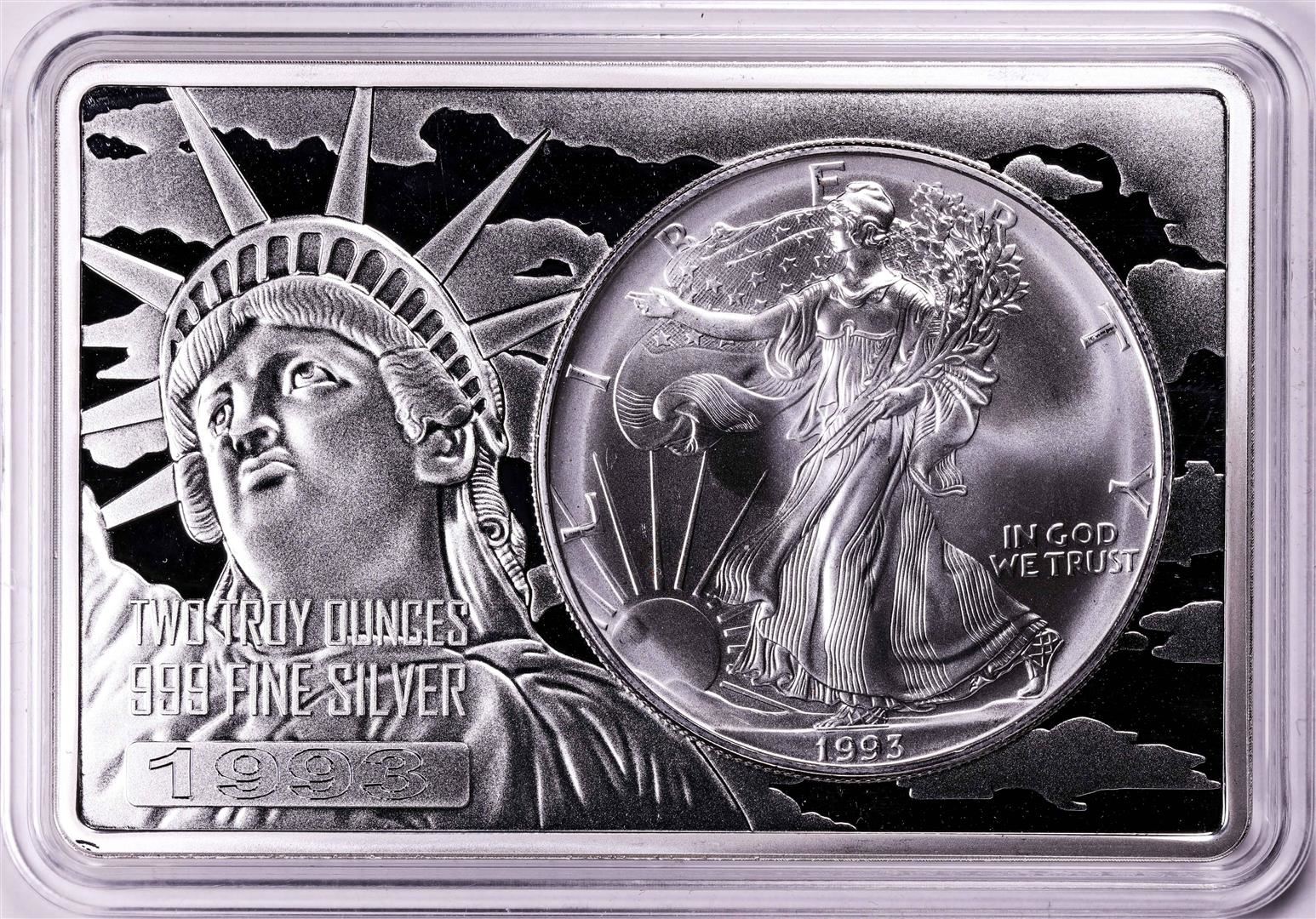 One 1993 $1 American Silver Eagle Coin & 2oz Silver Bar Set.