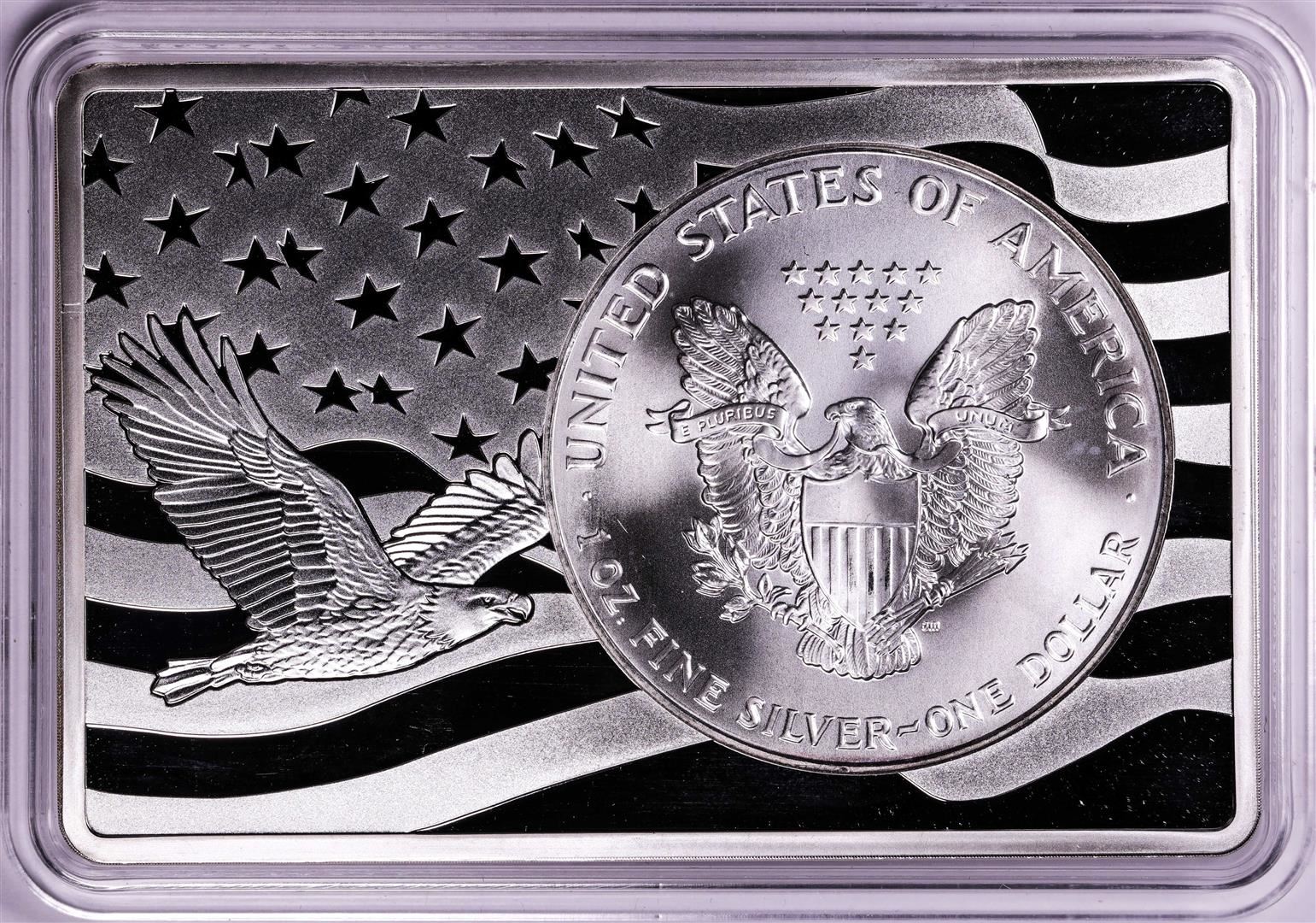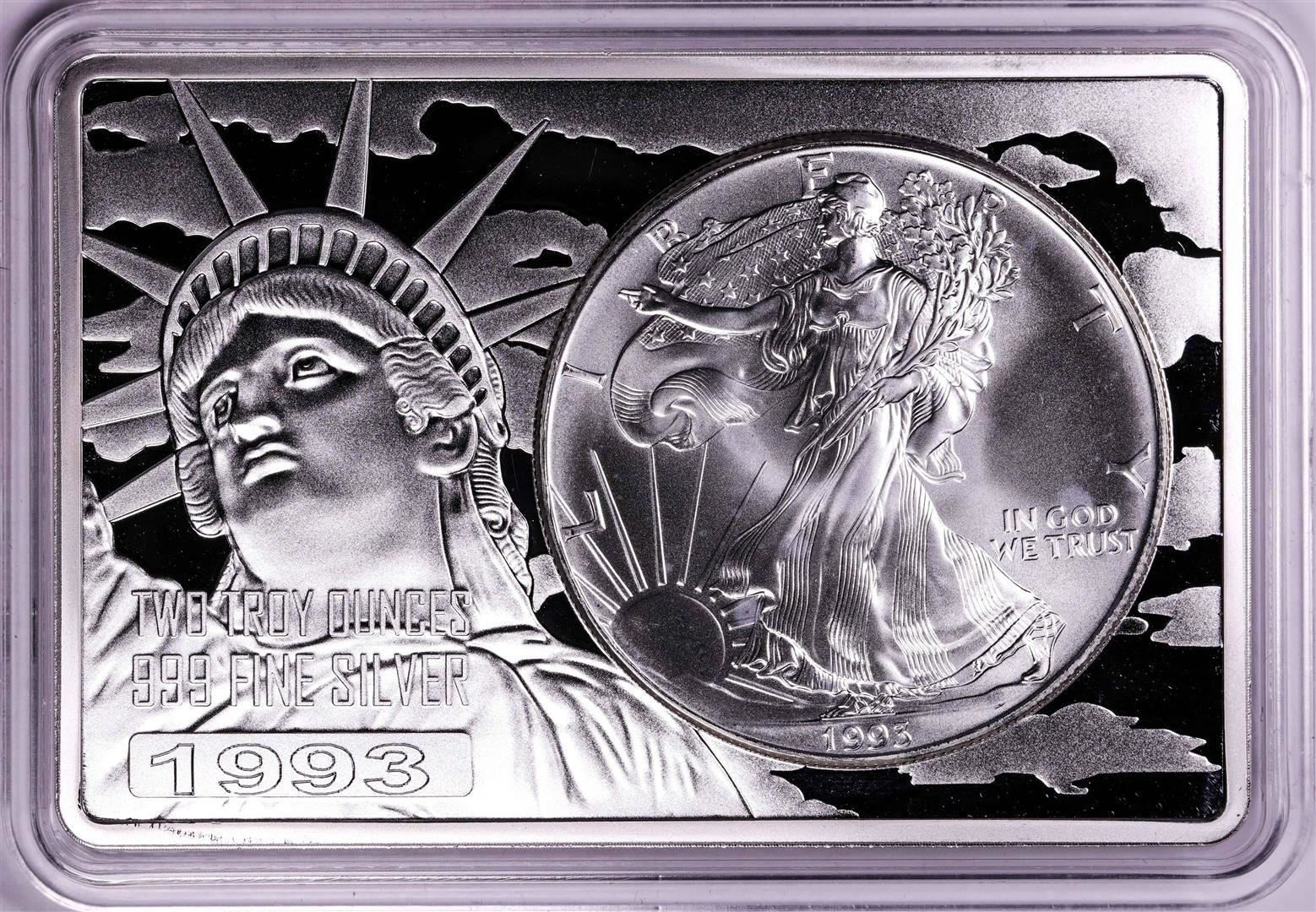 One 1993 $1 American Silver Eagle Coin & 2oz Silver Bar Set.