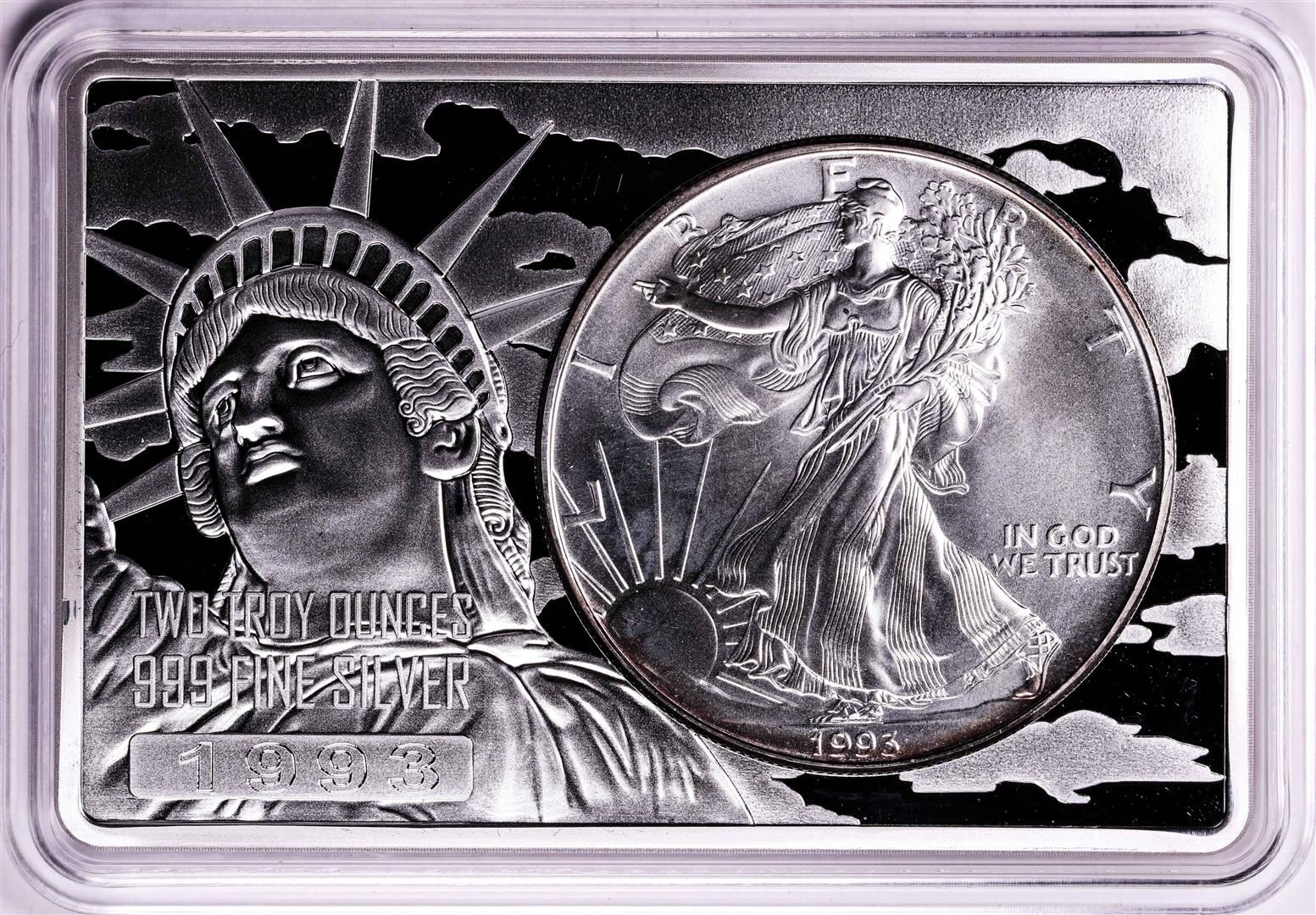 One 1993 $1 American Silver Eagle Coin & 2oz Silver Bar Set.