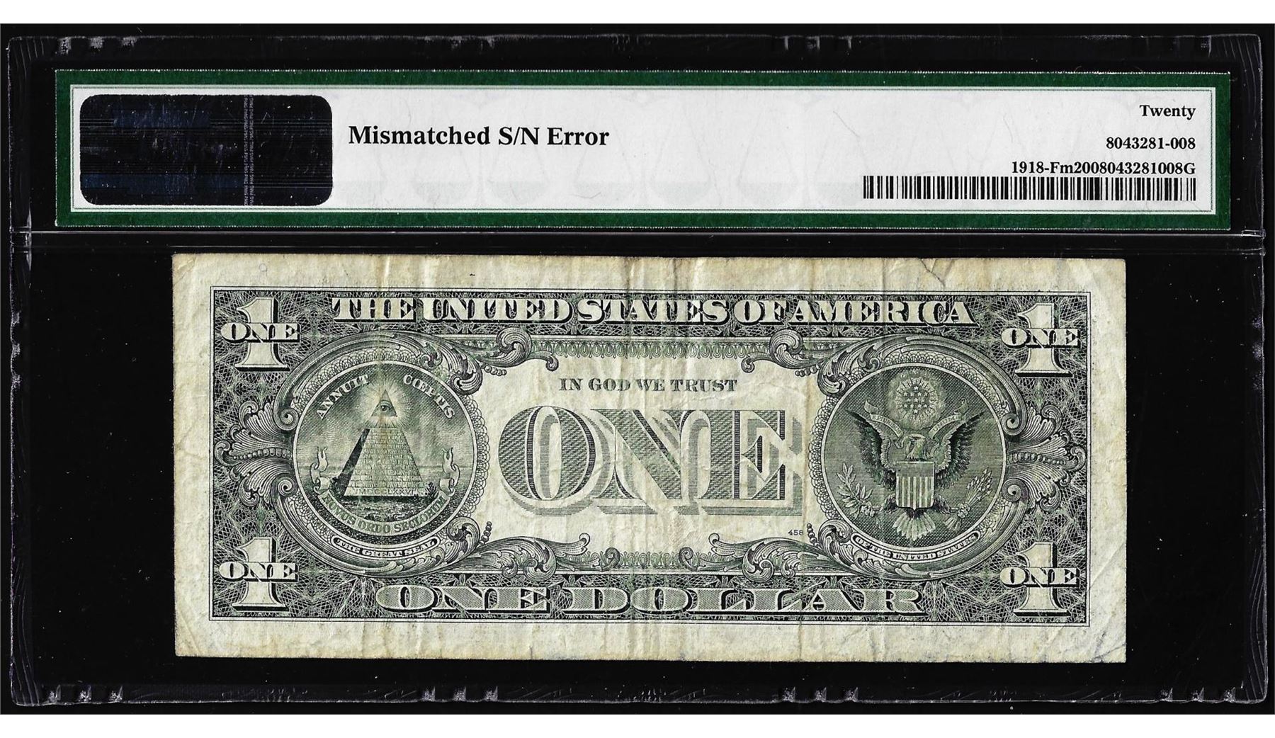 One 1993 $1 Federal Reserve Note Mismatched Serial Number Error Fr.1918-Fm PMG Very Fine 20. PMG Certified.
