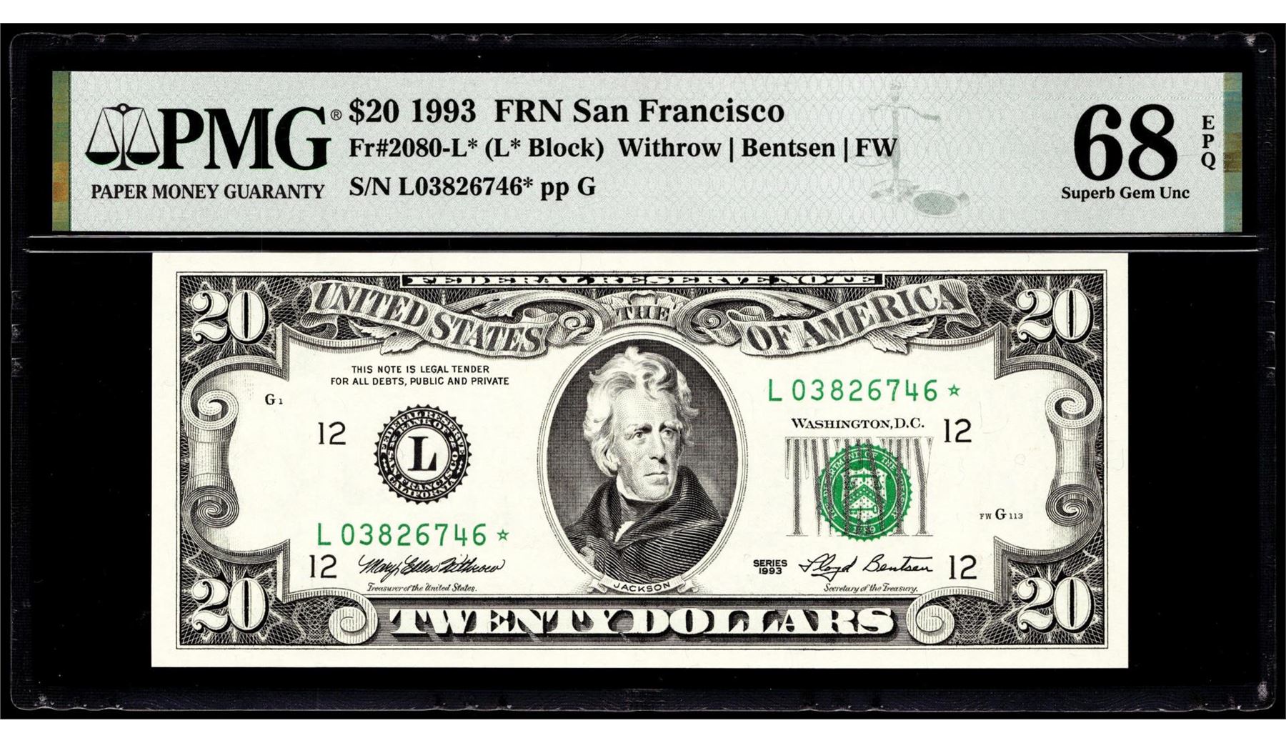 1993 $20 Federal Reserve STAR Note San Francisco Fr.2080-L* PMG Super Gem Unc 67EPQ