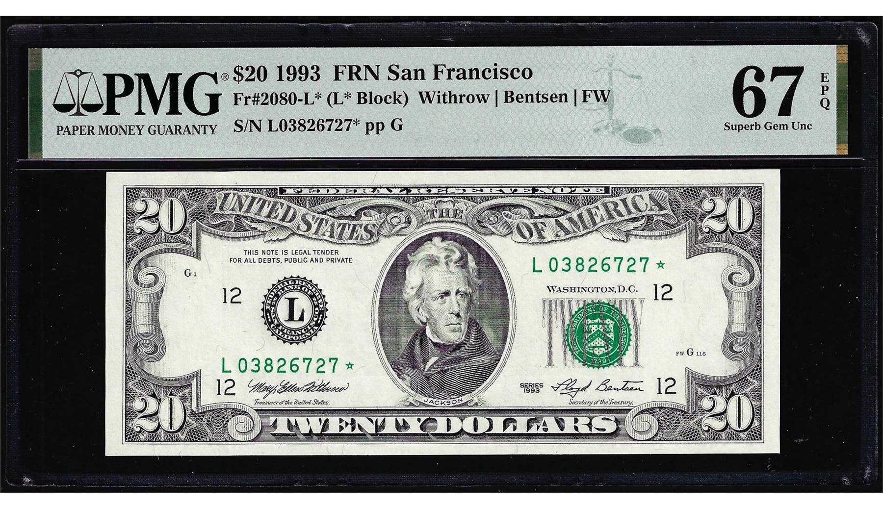 One 1993 $20 Federal Reserve Star Note San Francisco Fr.2080-L* PMG Superb Gem Unc 67EPQ. PMG Certified.