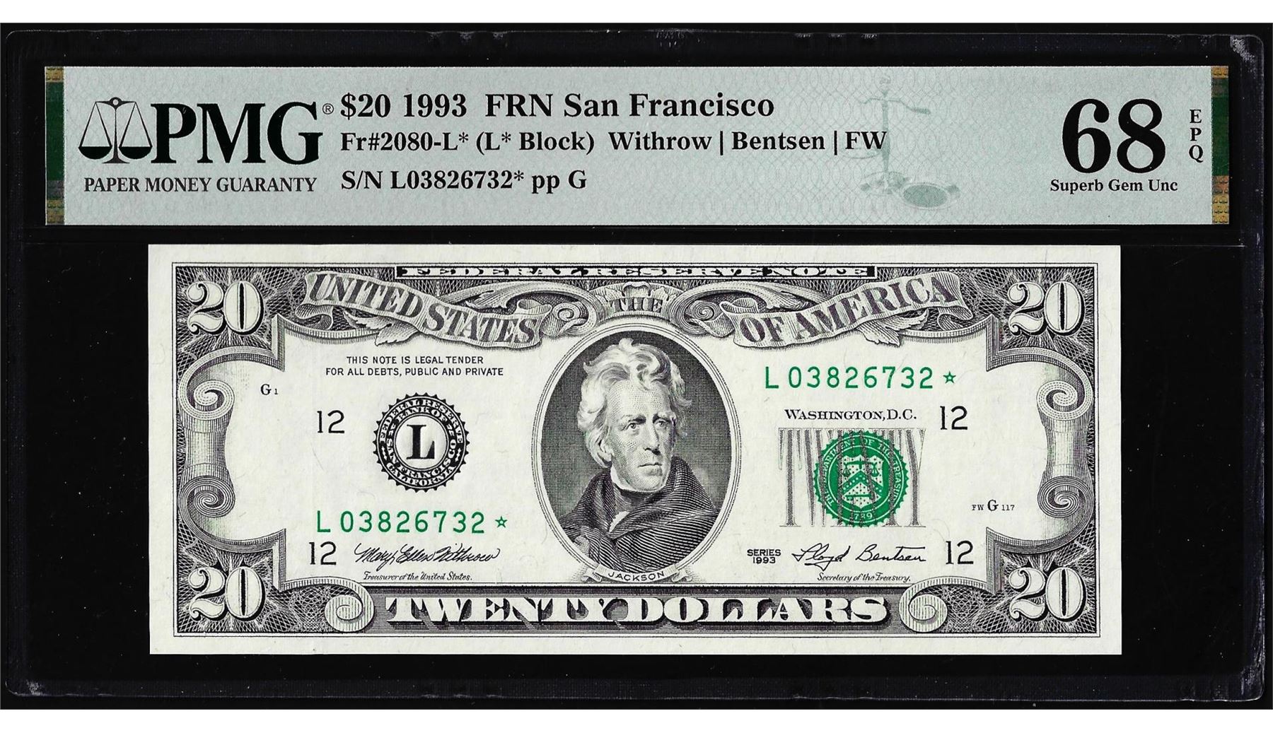 One 1993 $20 Federal Reserve Star Note San Francisco Fr.2080-L* PMG Superb Gem Unc 68EPQ. PMG Certified.