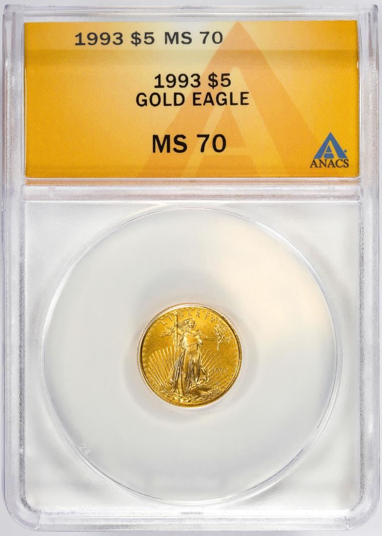 One 1993 $5 American Gold Eagle Coin ANACS MS70. ANACS Certified.