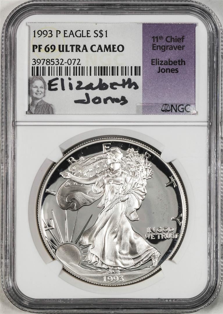 One 1993-P $1 Proof American Silver Eagle Coin NGC PF69 Ultra Cameo Elizabeth Jones Signature. NGC Certified.