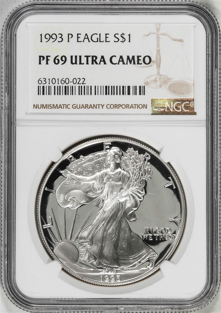One 1993-P $1 Proof American Silver Eagle Coin NGC PF69 Ultra Cameo. NGC Certified.