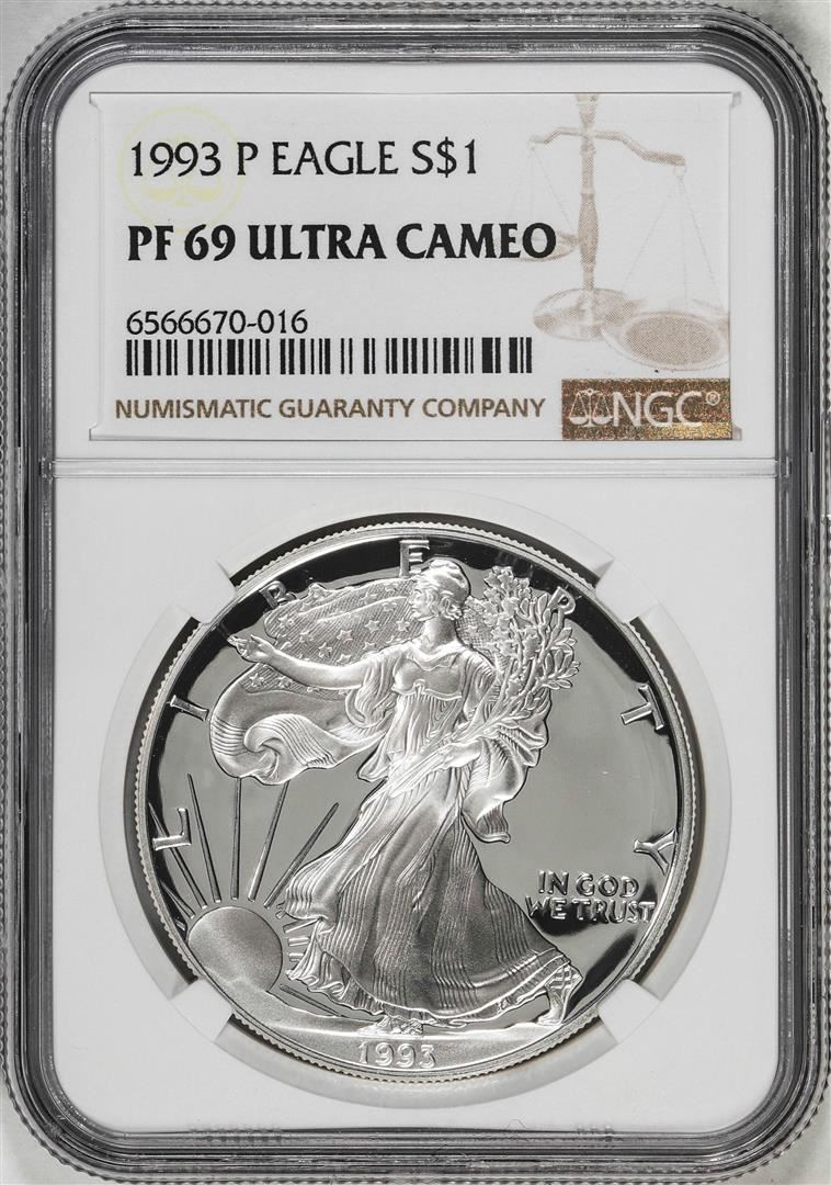 One 1993-P $1 Proof American Silver Eagle Coin NGC PF69 Ultra Cameo. NGC Certified.