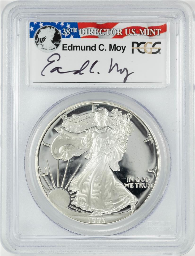 One 1993-P $1 Proof American Silver Eagle Coin PCGS PR69DCAM Edmund Moy Signature. PCGS Graded.