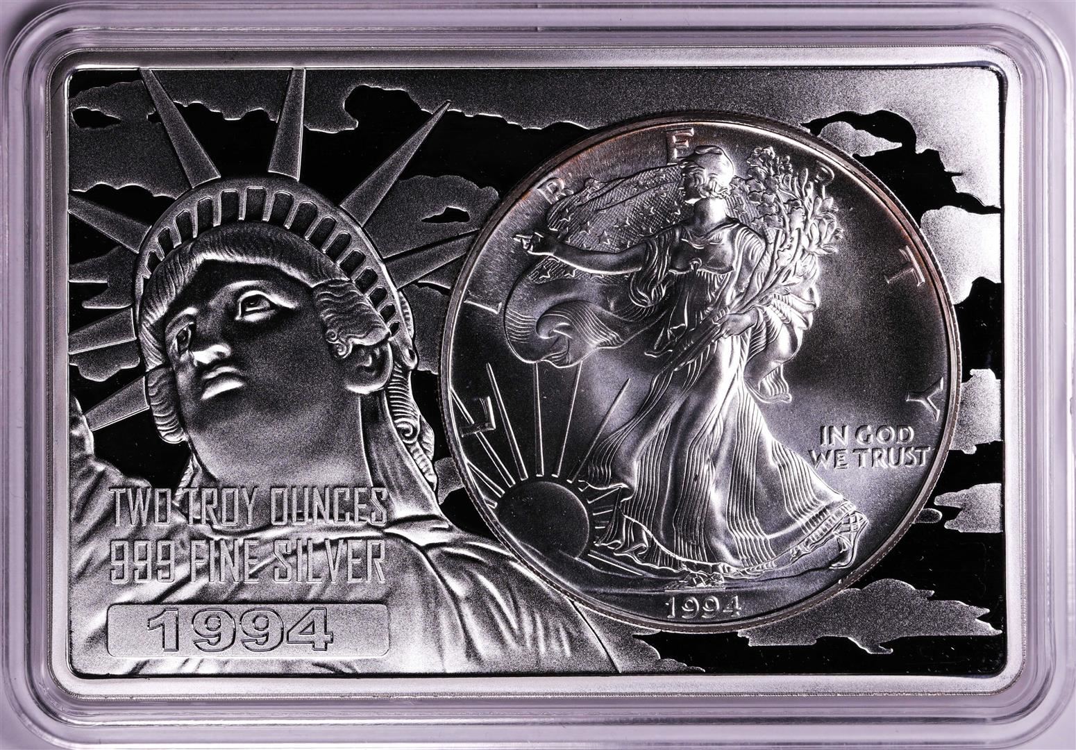 One 1994 $1 American Silver Eagle Coin & 2oz Silver Bar Set.