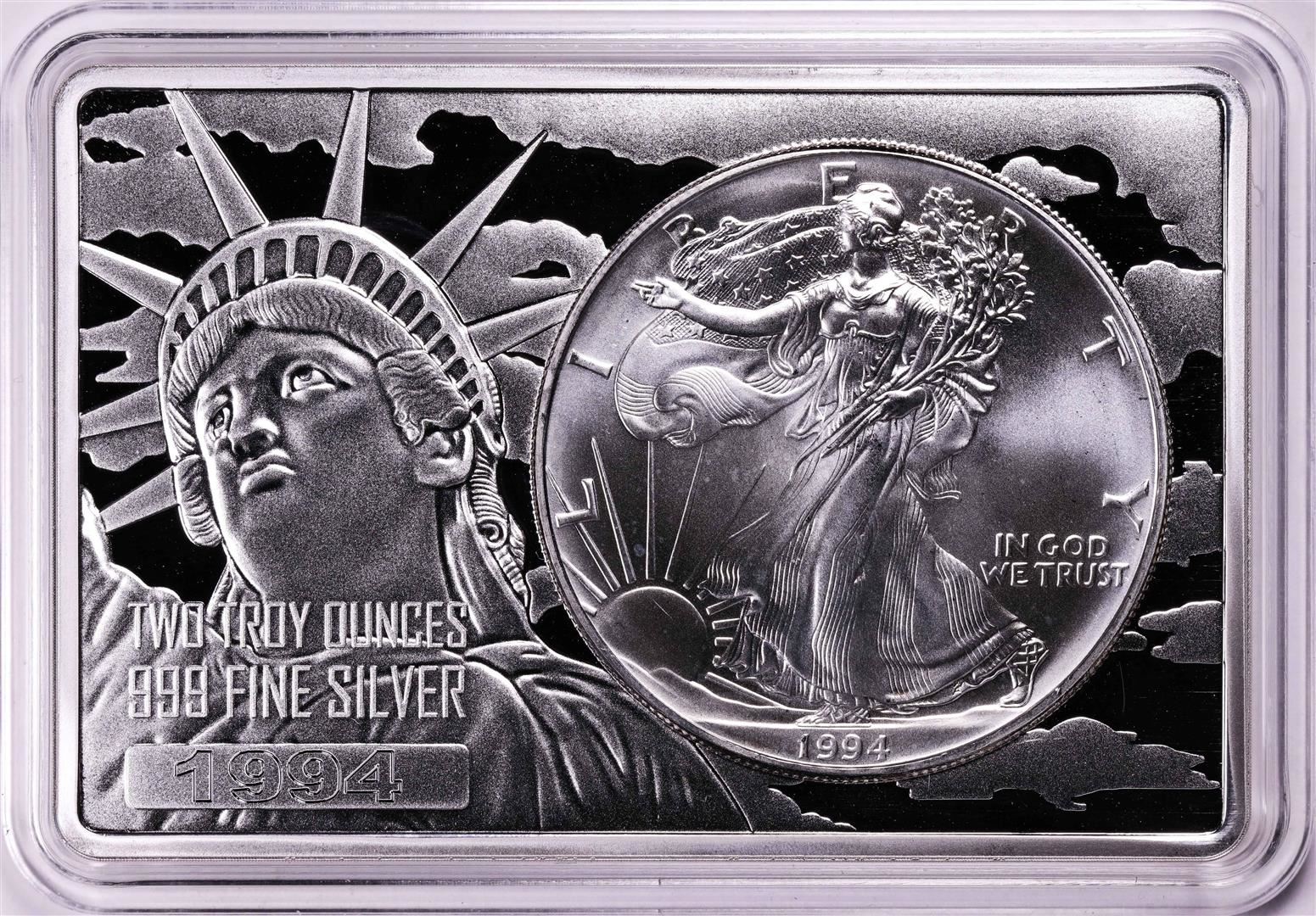 One 1994 $1 American Silver Eagle Coin & 2oz Silver Bar Set.