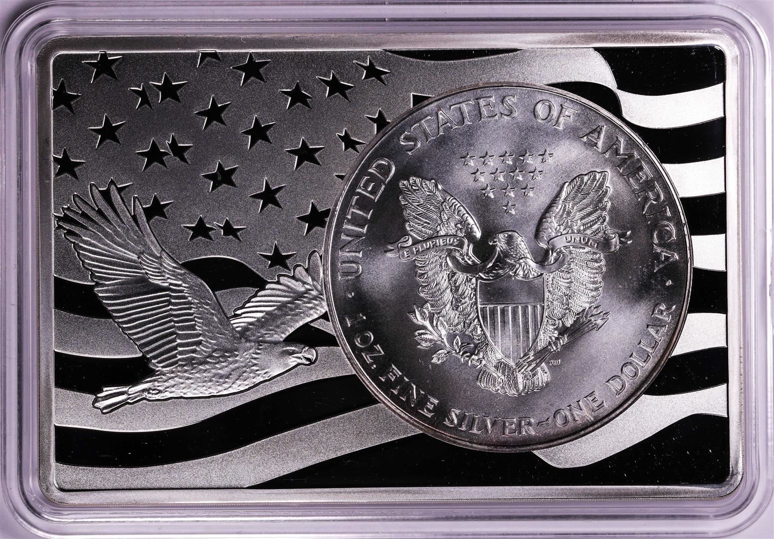 One 1994 $1 American Silver Eagle Coin & 2oz Silver Bar Set.