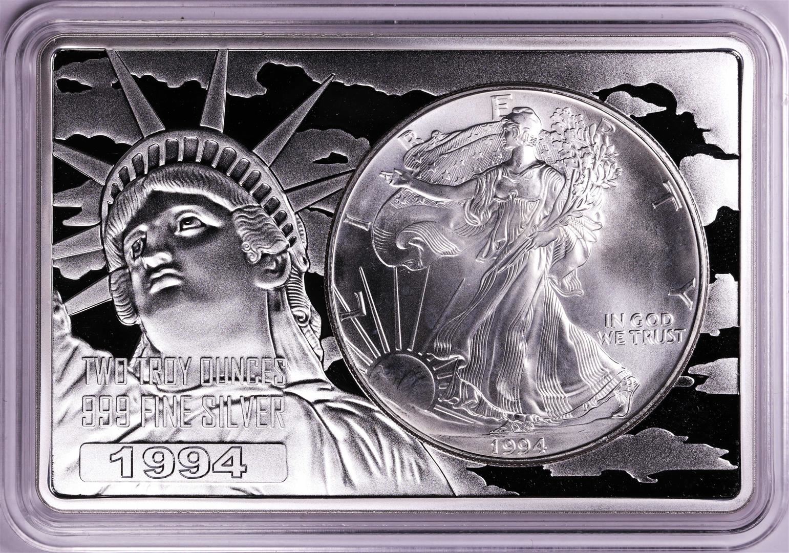 One 1994 $1 American Silver Eagle Coin & 2oz Silver Bar Set.
