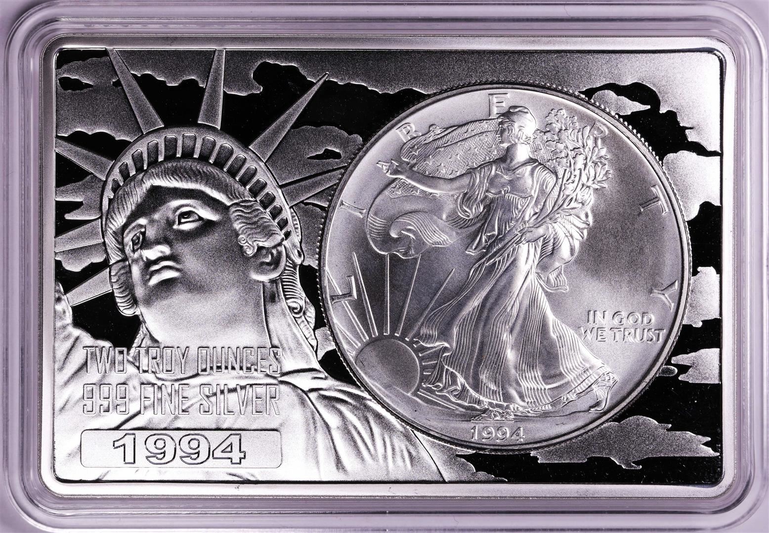 One 1994 $1 American Silver Eagle Coin & 2oz Silver Bar Set.
