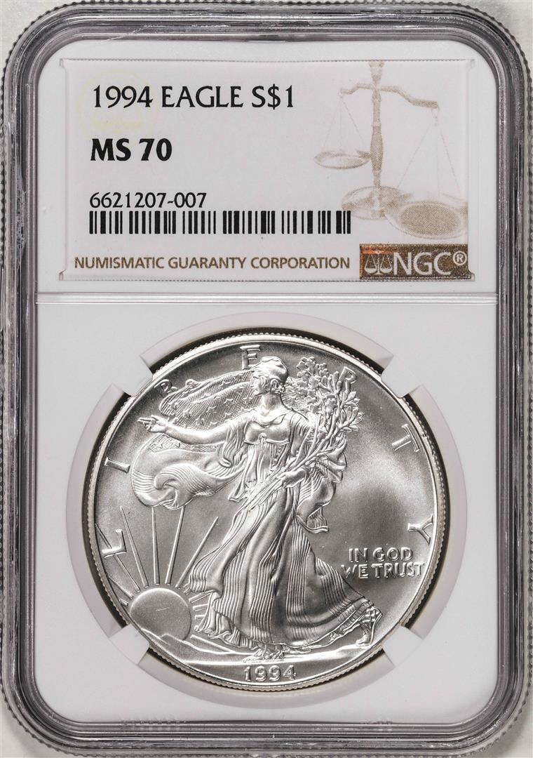 One 1994 $1 American Silver Eagle Coin NGC MS70. NGC Certified.