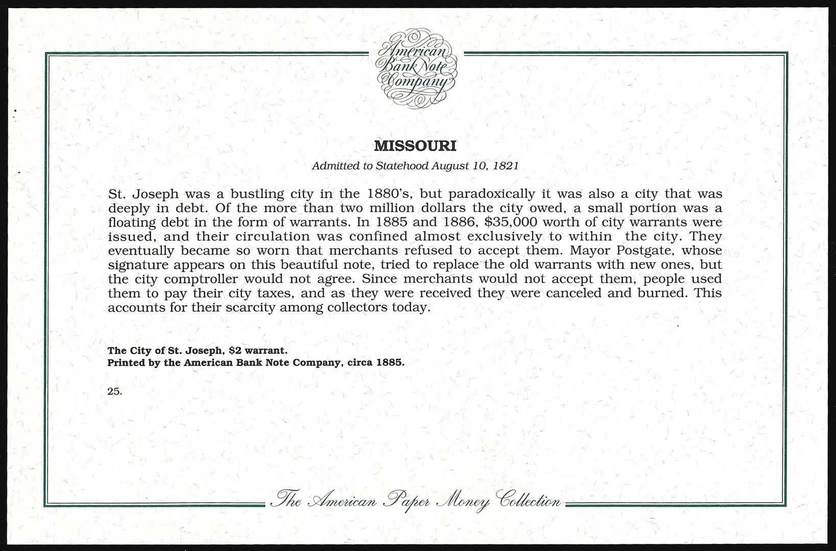 One 1994 American Bank Note Company Intaglio Print City of Saint Joseph, MO.