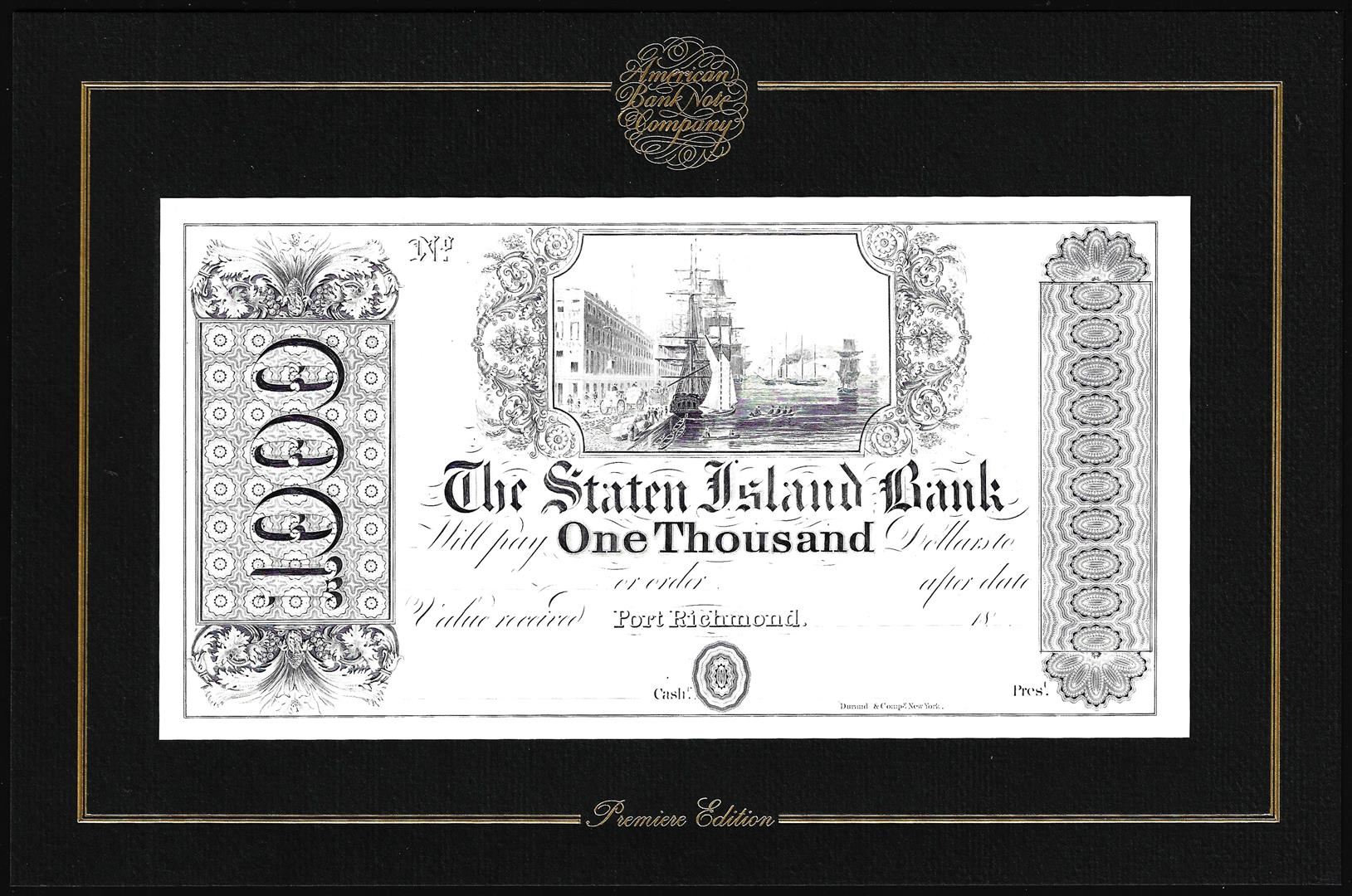 One 1994 American Bank Note Company Intaglio Print Staten Island Bank Port Richmond, NY.