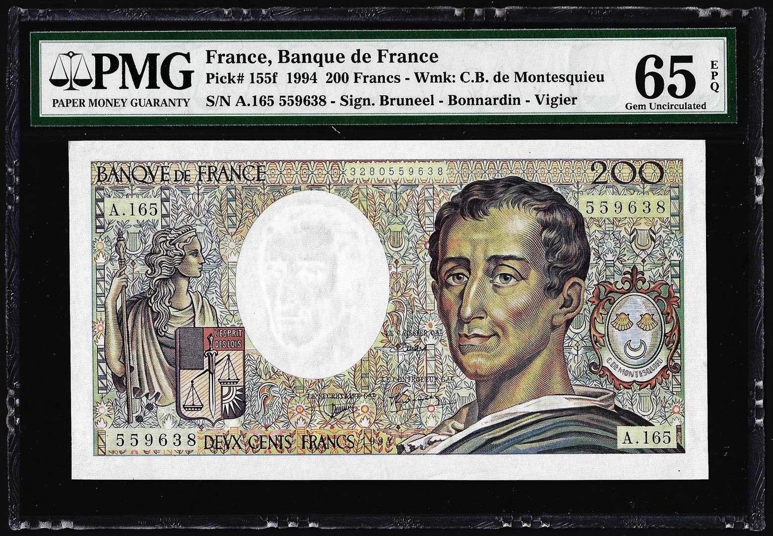 1994 France Banque de France 200 Francs Note Pick# 155f PMG Gem Uncirculated 65EPQ
