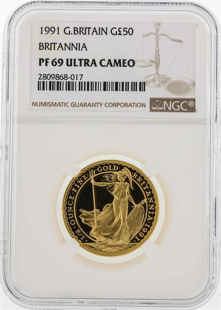 One 1994 Great Britain Britannia 50 Pounds Gold Silver Coin NGC PF69 Ultra Cameo. NGC Certified.