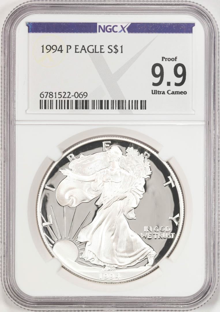 One 1994-P $1 American Silver Eagle Coin NGCX Proof 9.9 Ultra Cameo. NGC Certified.