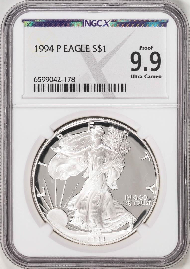 One 1994-P $1 American Silver Eagle Coin NGCX Proof 9.9 Ultra Cameo. NGC Certified.