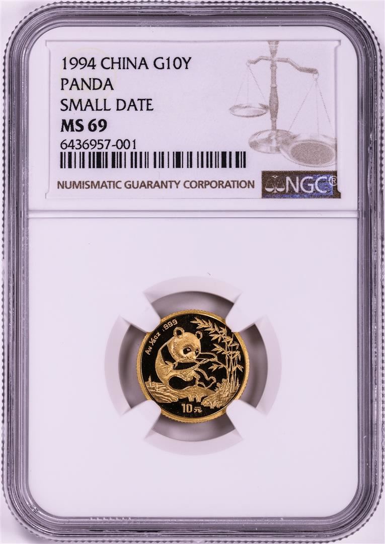 1994 Small Date China 10 Yuan Panda 1/10 oz. Gold Coin NGC MS69