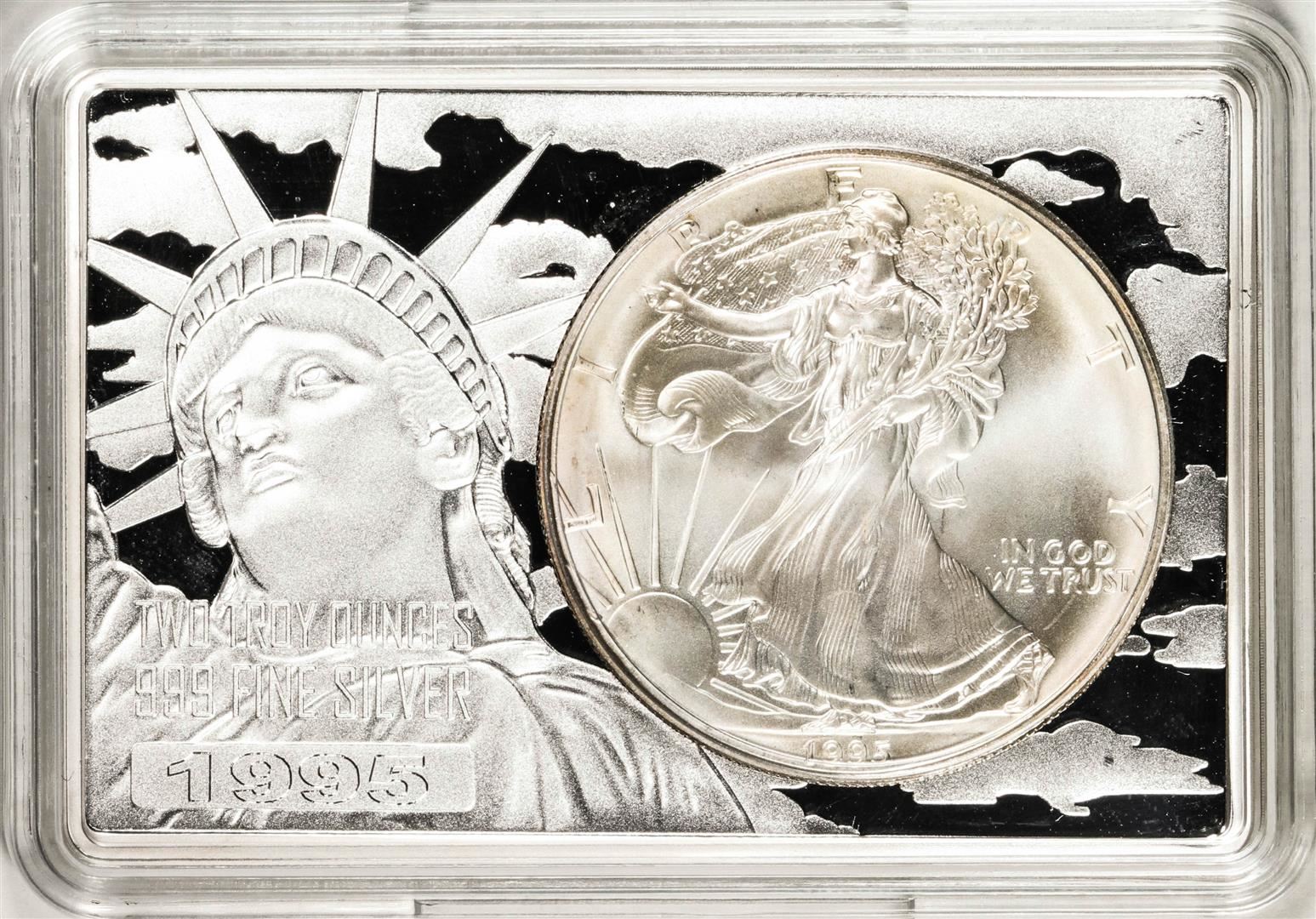 One 1995 $1 American Silver Eagle Coin & 2oz Silver Bar Set.