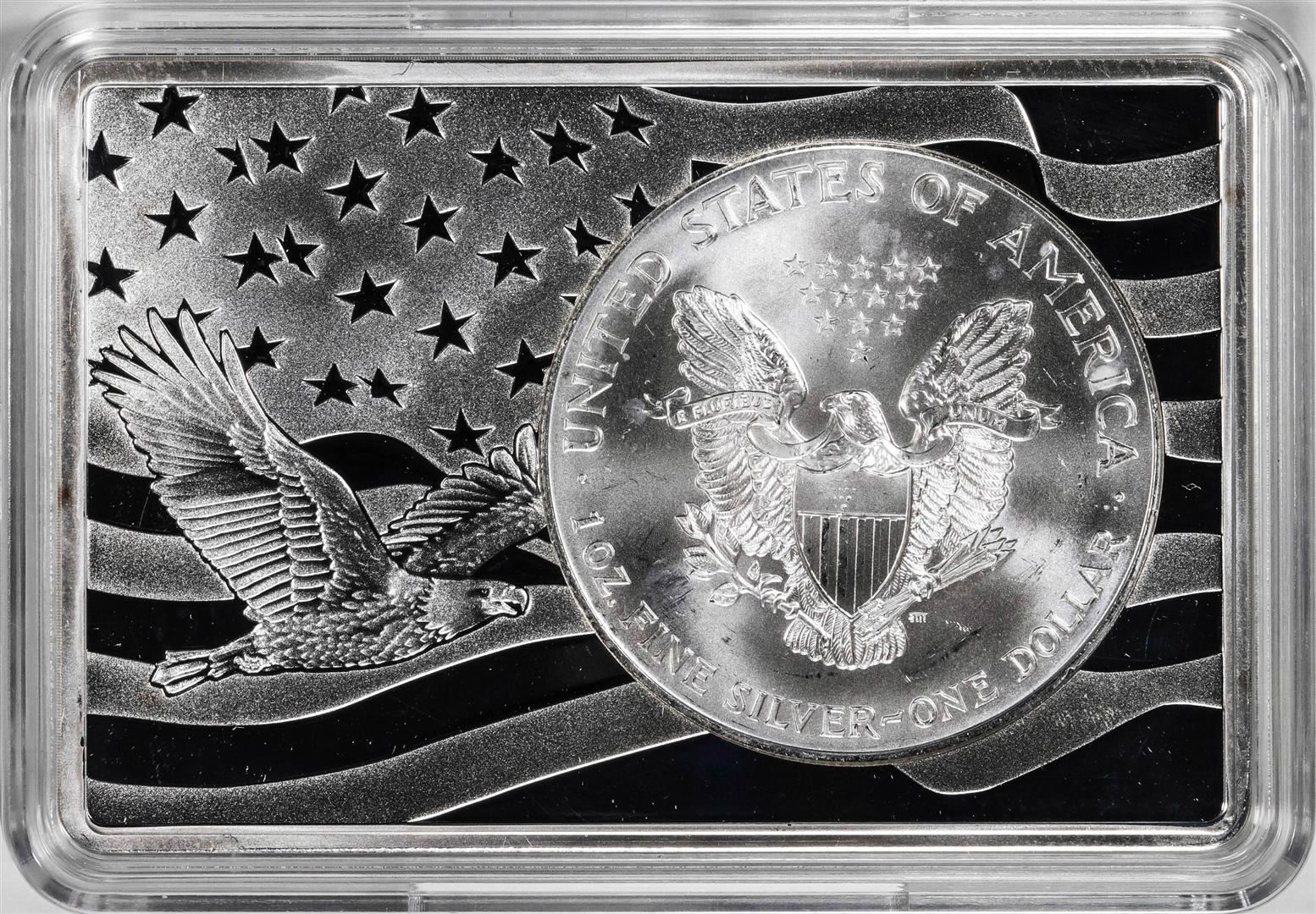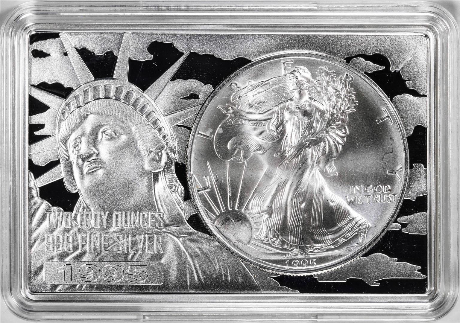One 1995 $1 American Silver Eagle Coin & 2oz Silver Bar Set.