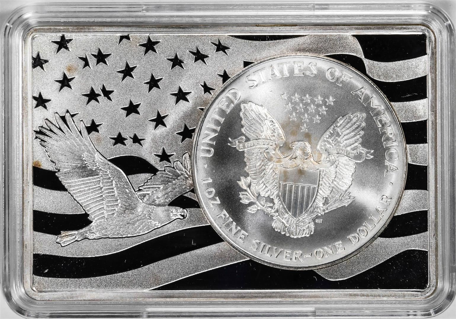 One 1995 $1 American Silver Eagle Coin & 2oz Silver Bar Set.