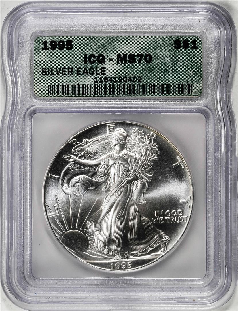 One 1995 $1 American Silver Eagle Coin ICG MS70. ICG Certified.