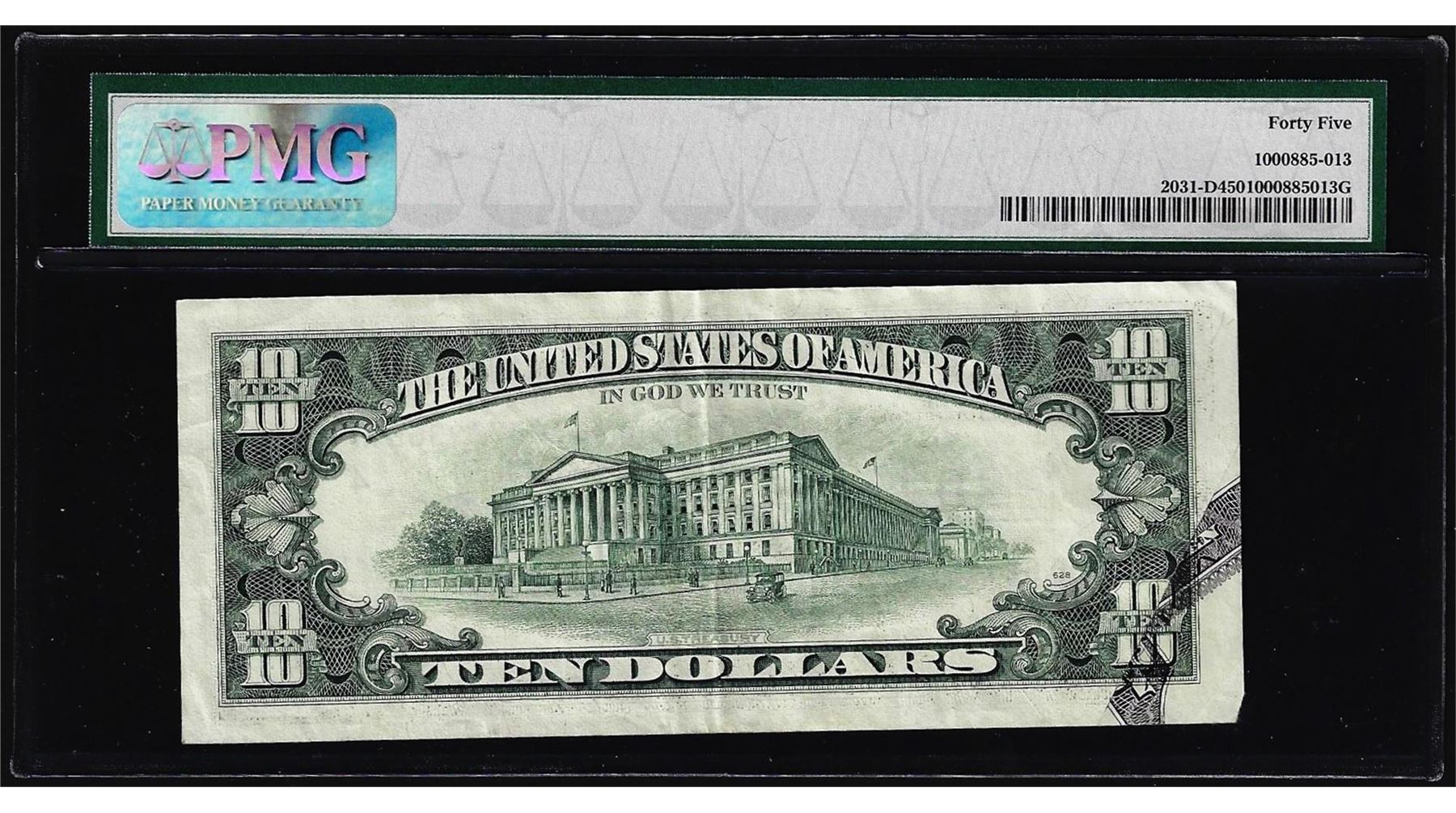 One 1995 $10 Federal Reserve Note ERROR 2nd Printing Obstructed PMG Choice Extremely Fine 45. PMG Certified.