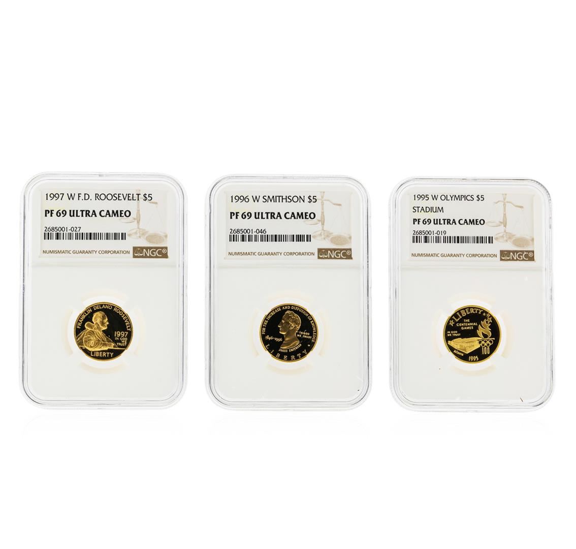 This 1995-1997 $5 Commemorative Gold Coin Set NGC Graded PF69 Ultra Cameo includes the following Commemoratives include 1995-W Olympics, 1996-W Smithsonian, and 1997-W F.D. Roosevelt Coins all NGC graded PF 69 Ultra Cameo. NGC Certified.