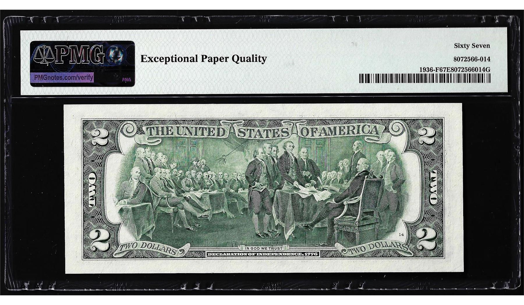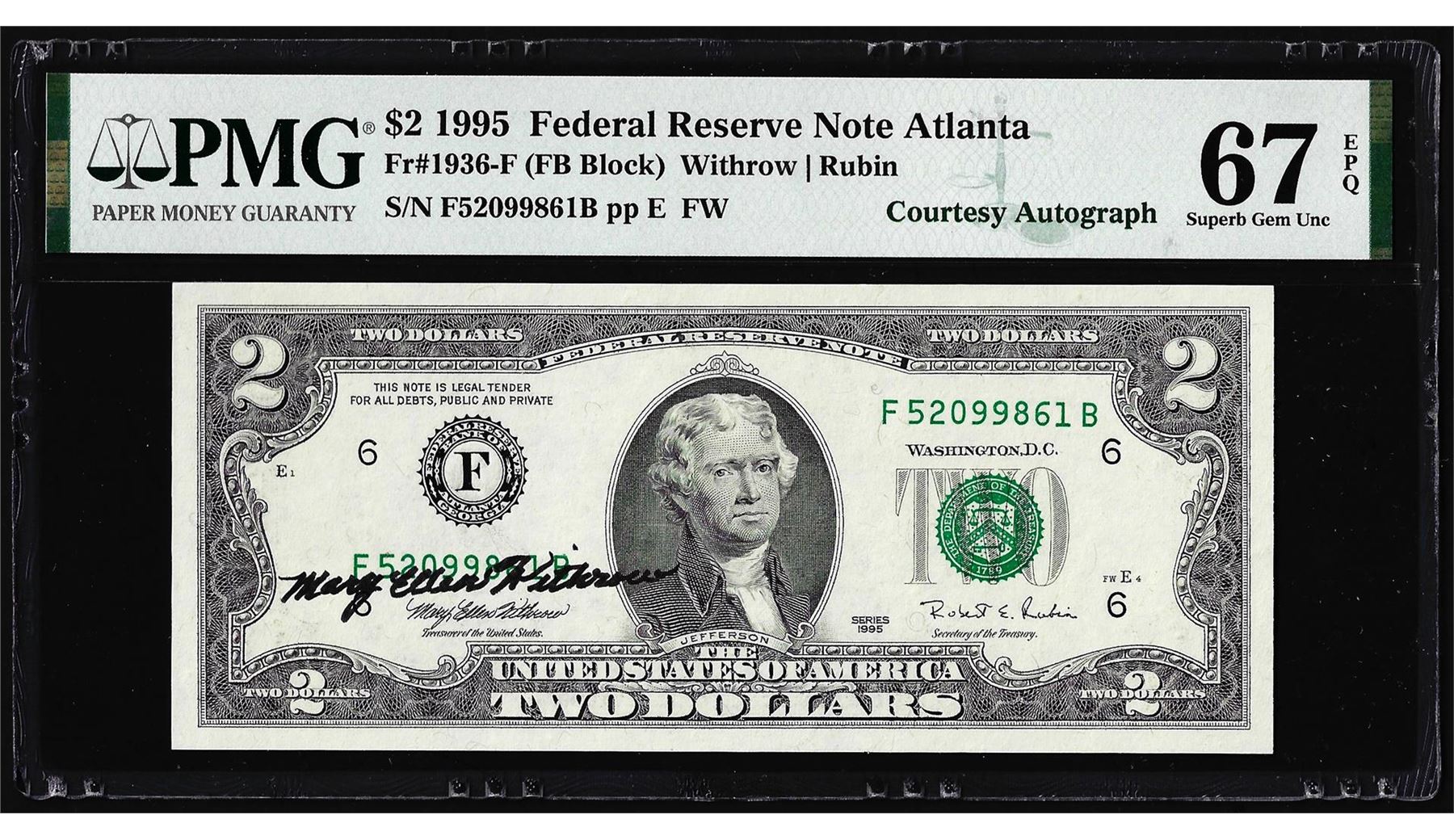 1995 $2 Federal Reserve Note PMG Superb Gem Uncirculated 67EPQ Courtesy Autograph