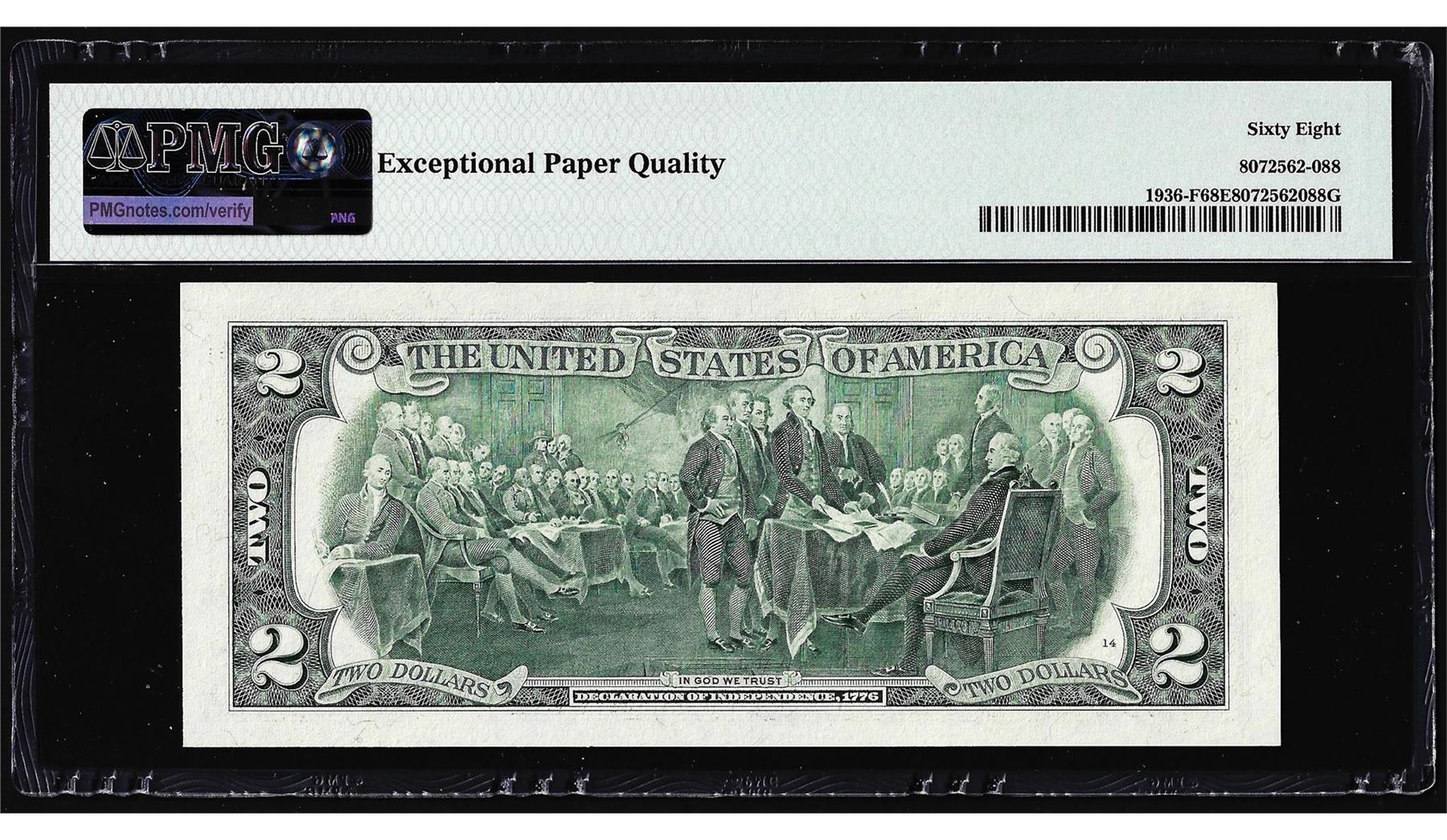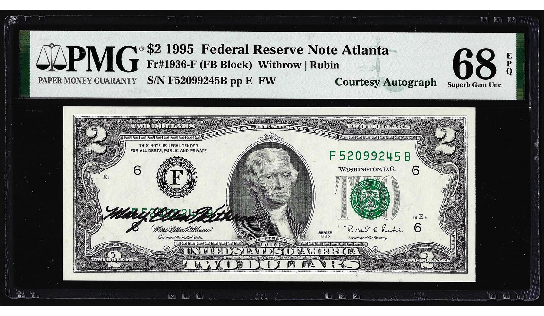 One 1995 $2 Federal Reserve Note PMG Superb Gem Uncirculated 68EPQ Courtesy Autograph. PMG Certified.