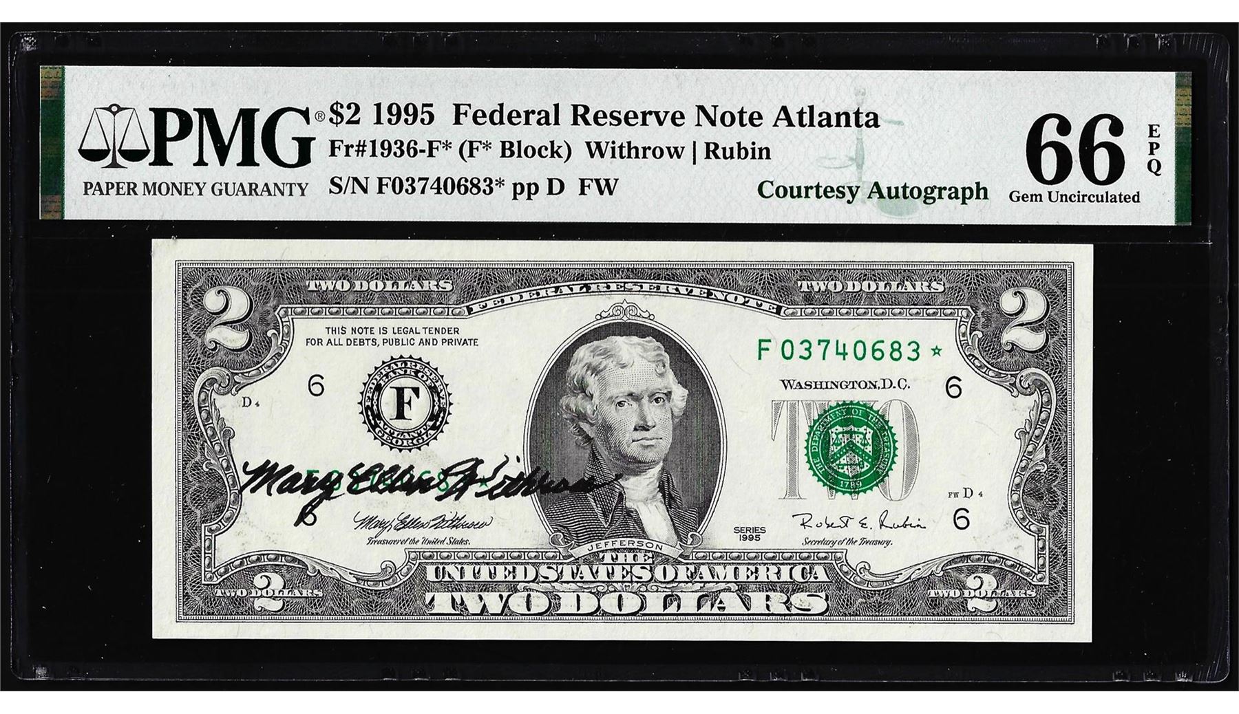 1995 $2 Federal Reserve Star Note Atlanta Courtesy Auto PMG Gem Uncirculated 66EPQ
