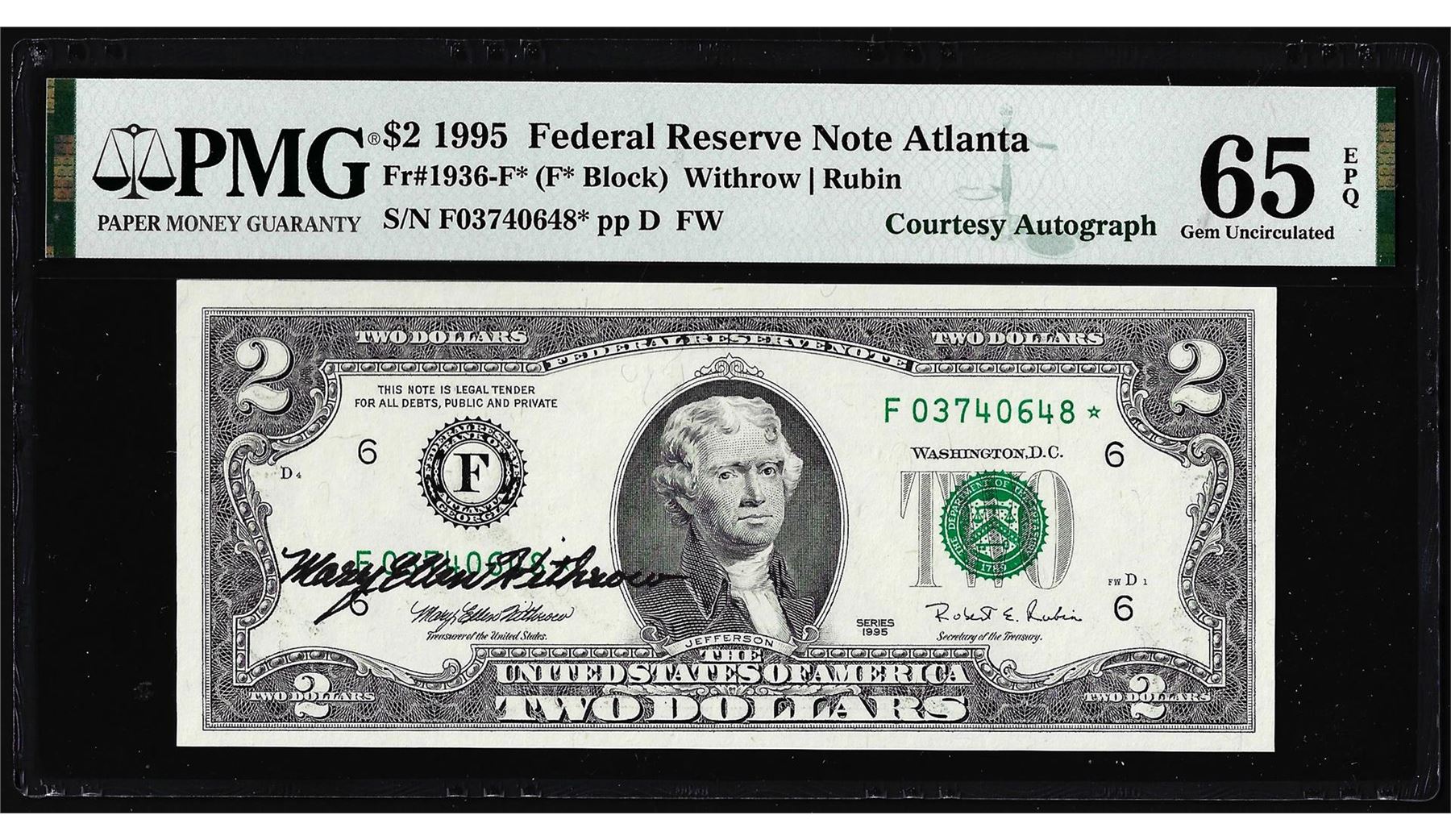 One 1995 $2 Federal Reserve Star Note PMG Gem Uncirculated 65EPQ Courtesy Autograph. PMG Certified.