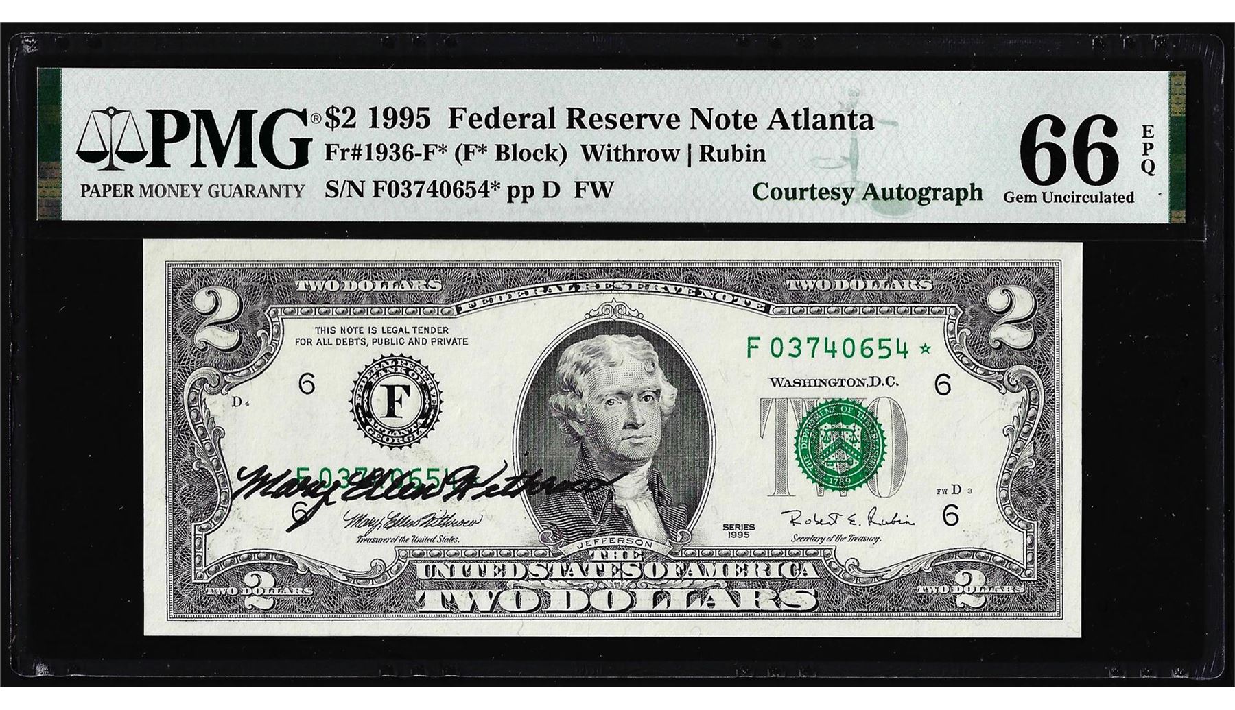 1995 $2 Federal Reserve Star Note PMG Gem Uncirculated 66EPQ Courtesy Autograph